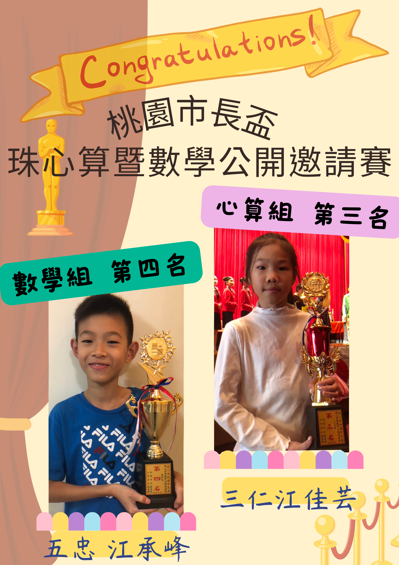 五年忠班 江承峰 榮獲 五年級 數學組 第四名(指導老師 鍾杏香老師)