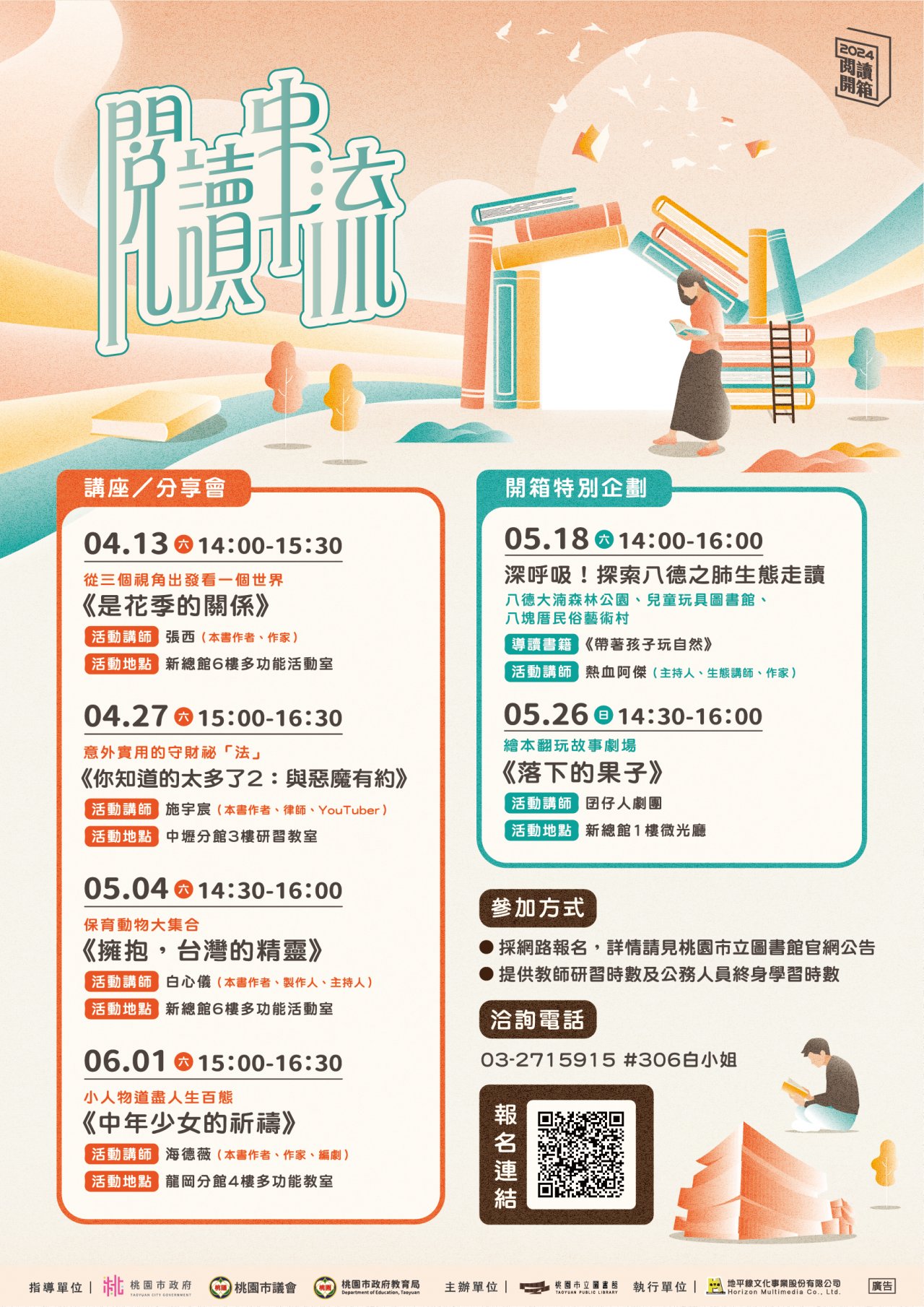 | 一、 | 「2024桃園閱讀開箱:閱讀串流」第一季系列活動於113年 4月13日至6月1日辦理,場次如下: |