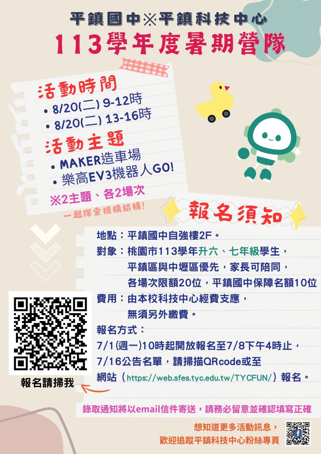 主旨: | 有關本校辦理平鎮自造教育及科技中心113年暑假營隊,敬請協助公告周知,活動辦法詳如說明,請查照。 |