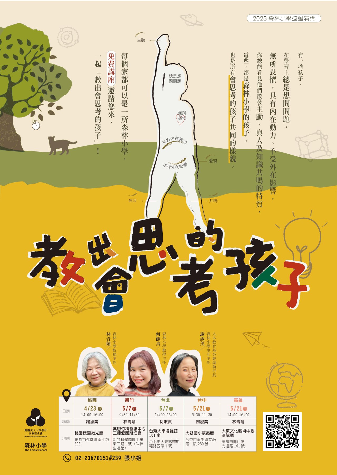 | 二、 | 本館與人本教育文教基金會合作舉辦「教出會思考的孩子-2023森林小學巡迴演講會(桃園場)」,本講座將分享森林小學教學理念及方法,包含如何啟發孩子思考、激發動力、傳遞方法;如何藉由「玩的學習」,培育孩子「成為他自己」,散發主動、與人及知識共鳴的特質。活動資訊如下: |