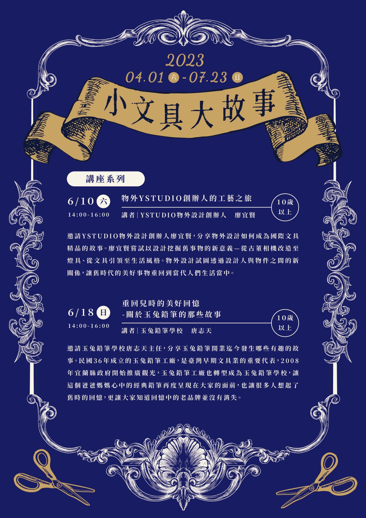| 一、 | 旨揭活動以「文具」為主軸,邀請2位相關領域講者分享品牌從本土至國際精品背後的故事,以及台灣文具產業的變化和傳承。 |