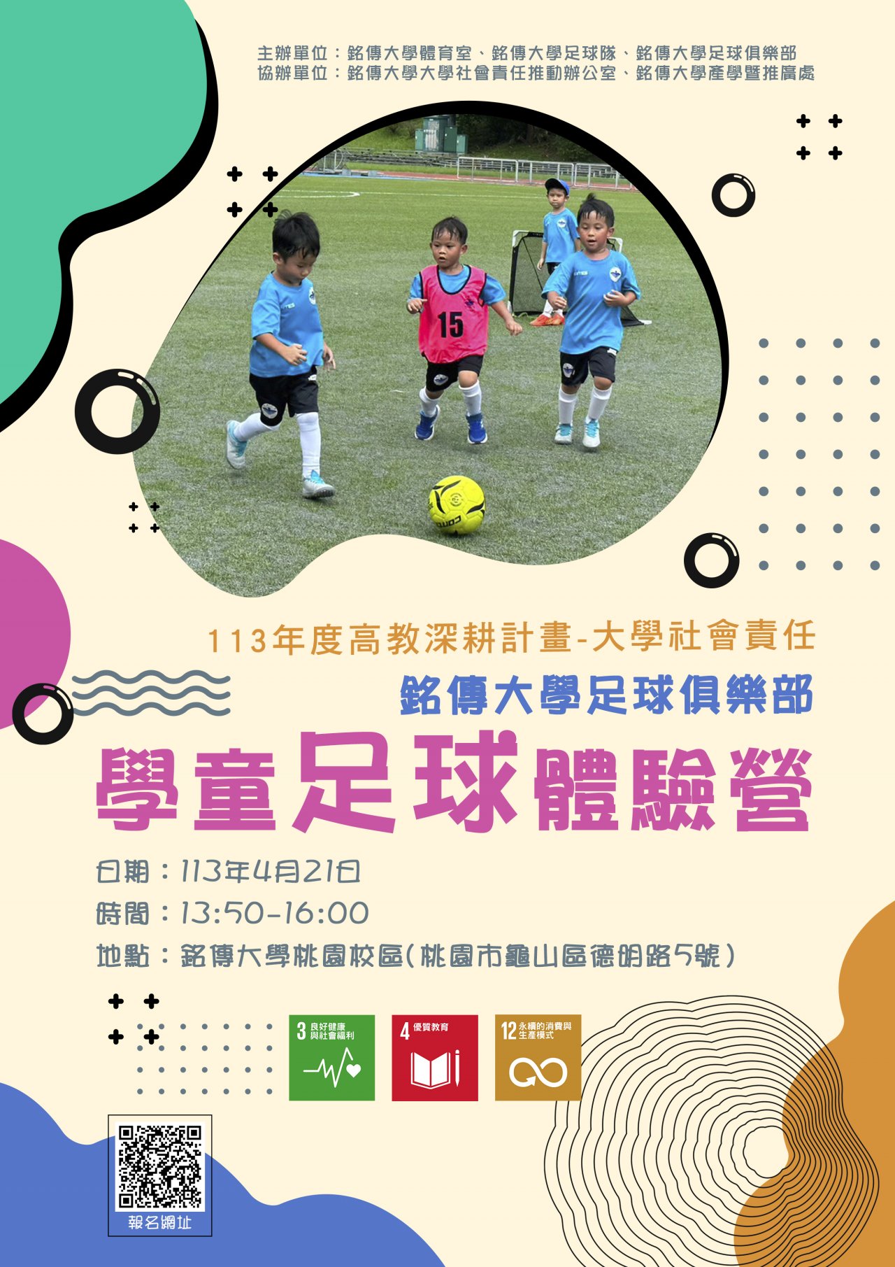 | 主旨: | 檢送本校推動大學社會責任(USR)辦理「銘傳大學足球俱樂部-學童足球體驗營(04月21日場次)」活動資訊,懇請貴校准予宣傳公告,不勝感激。 |