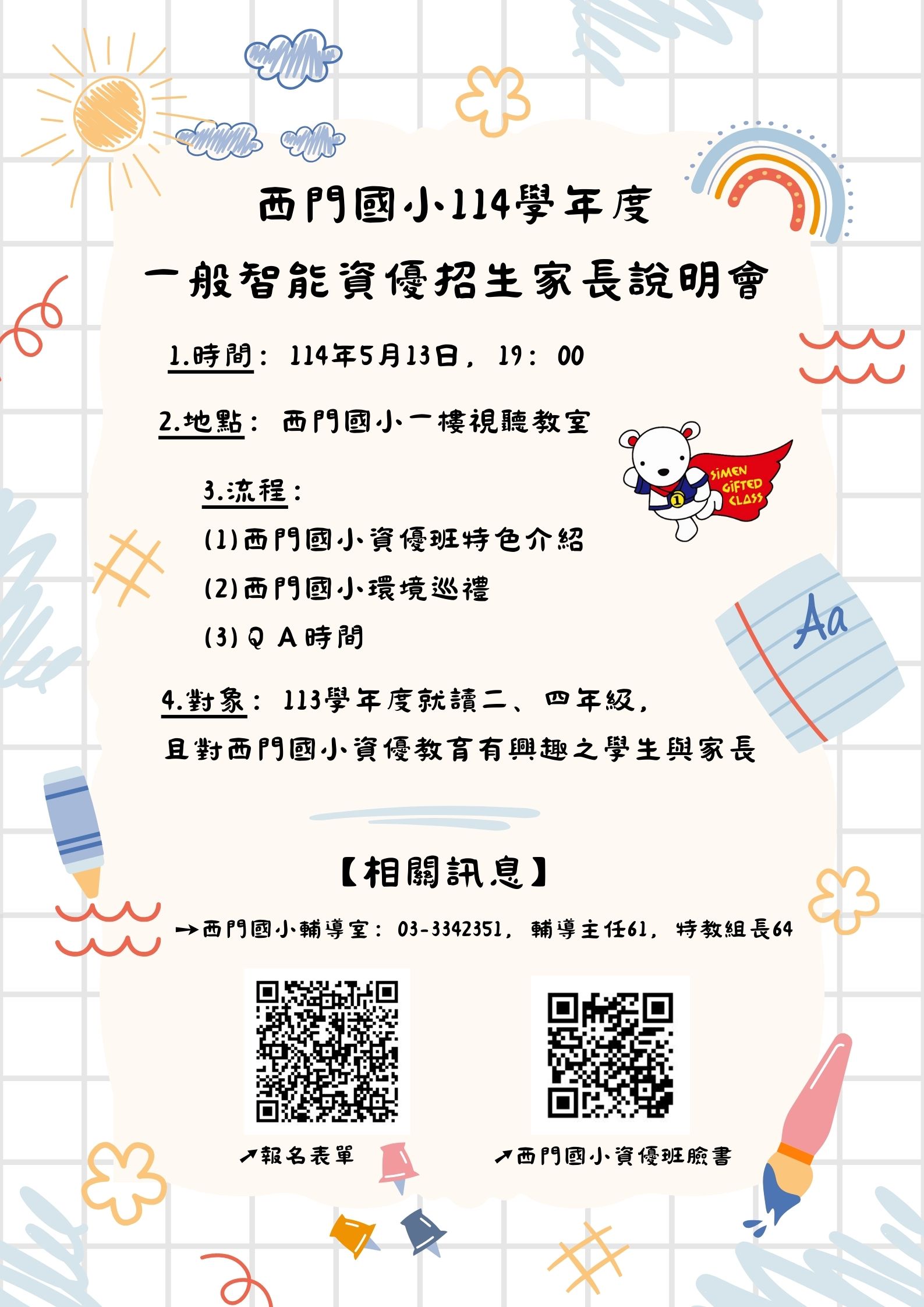 | 主旨: | 本校辦理「114學年度西門國小一般智能資優招生家長說明會」,敬邀貴校二年級及四年級家長參加,敬請惠予公告並轉知貴屬家長,請 查照。 |
