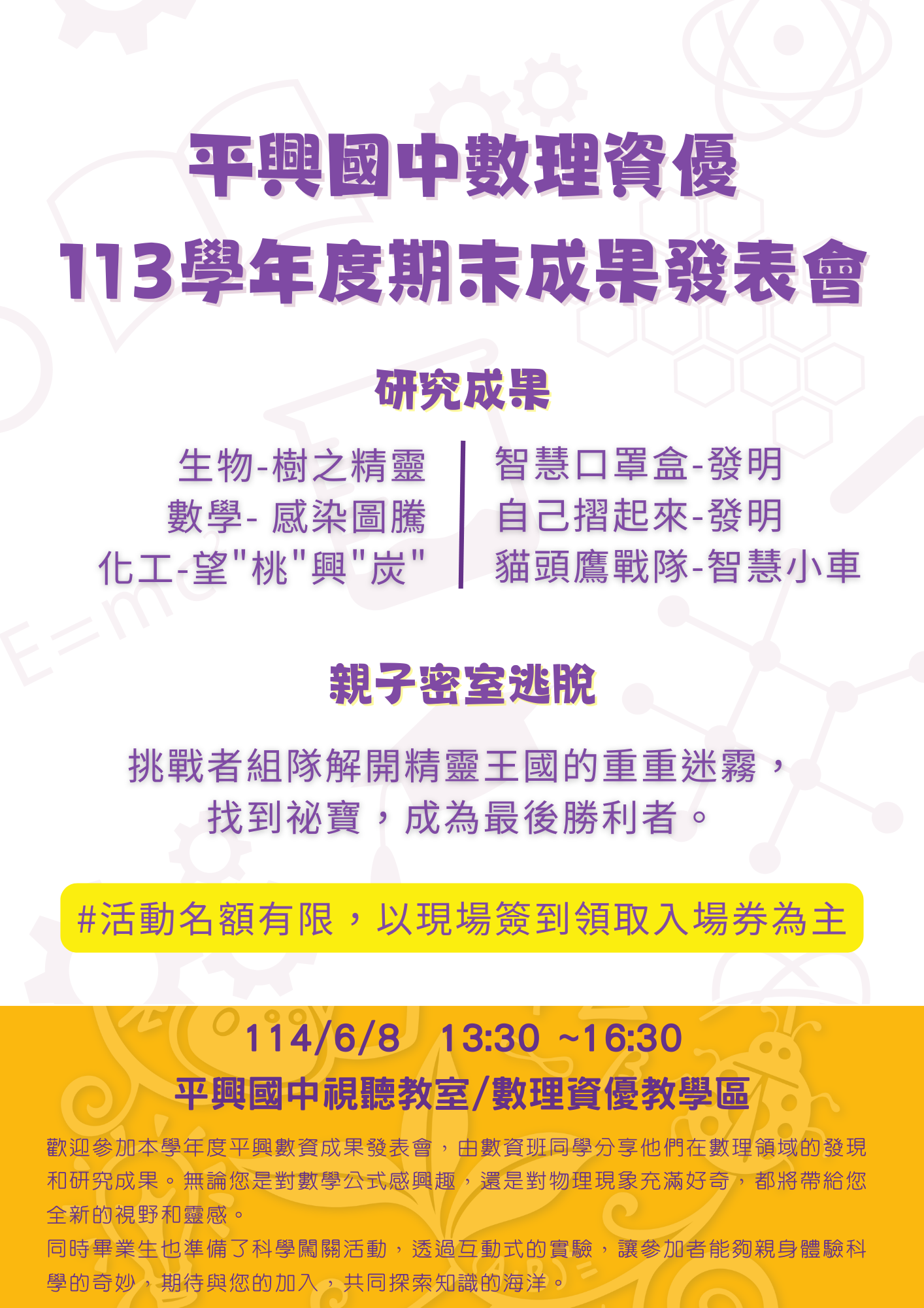 | 主旨: | 本校辦理「113學年度數理資優班成果發表會」活動,敬邀貴校親師生參加,請惠予公告,請查照。 |