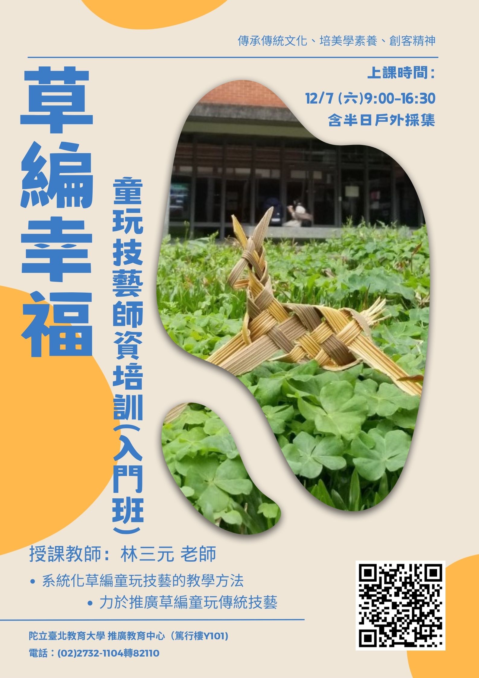 | 二、 | 草編幸福-童玩技藝師資培訓(進階班):113年12月14日(六)及12月15日(日)共9小時,全勤並通過評核將核發研習證明書。課程特聘專業草編達人「草編CEO林三元老師」親授,包含戶外採集、戶外與教室型態的教學示範、教學計劃撰寫、教學經驗分享等,歡迎18歲以上對草編童玩有興趣之教師或一般民眾報名。 |