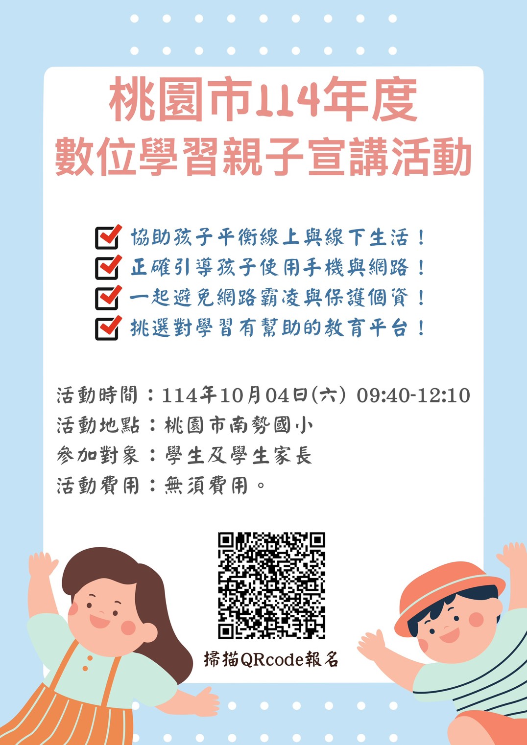 | 主旨: | 有關桃園市114年度「推動中小學數位學習精進方案」親子宣講暨種子教師培力計畫-南勢國小場次,請貴校協助公告活動訊息及鼓勵家長踴躍參加,請查照。 |