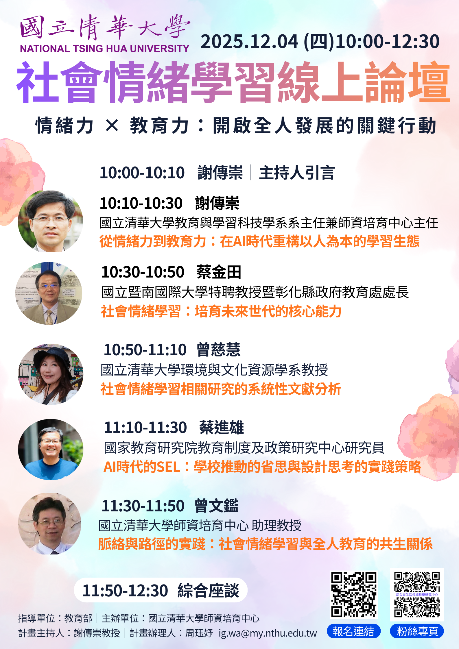 | 主旨: | 轉知國立清華大學辦理「社會情緒學習線上論壇-情緒力 × 教育力:開啟全人發展的關鍵行動」線上論壇,請查照。 |