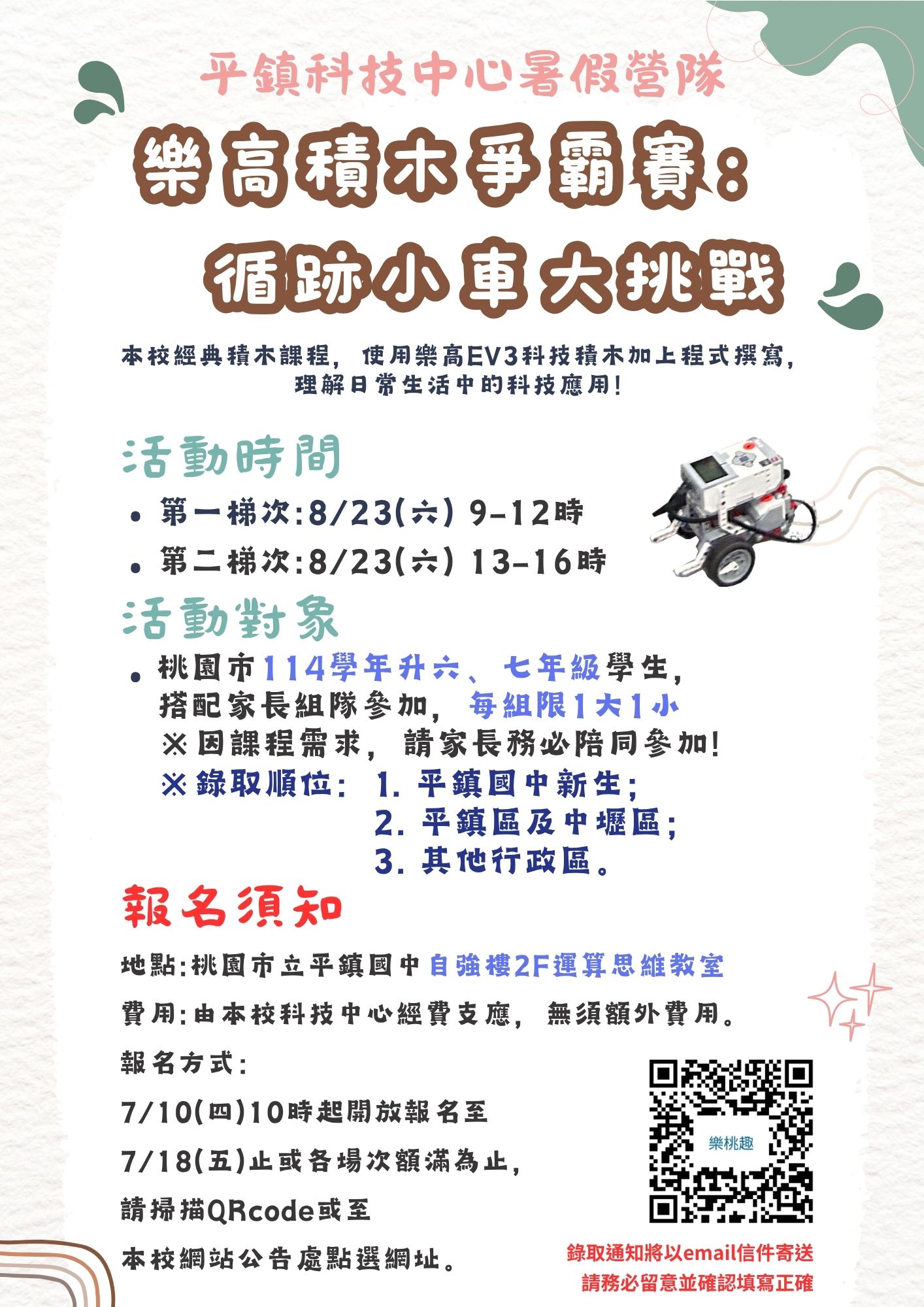 | 主旨: | 有關本校辦理平鎮自造教育及科技中心114年八月暑假親子營隊「樂高積木爭霸賽:循跡小車大挑戰」,敬請協助公告周知,活動辦法詳如說明,請查照。 |